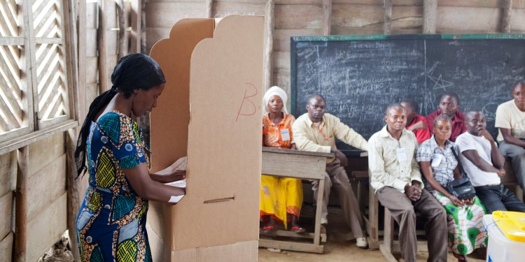 A woman votes while men look on during the DRC’s election in 2011.